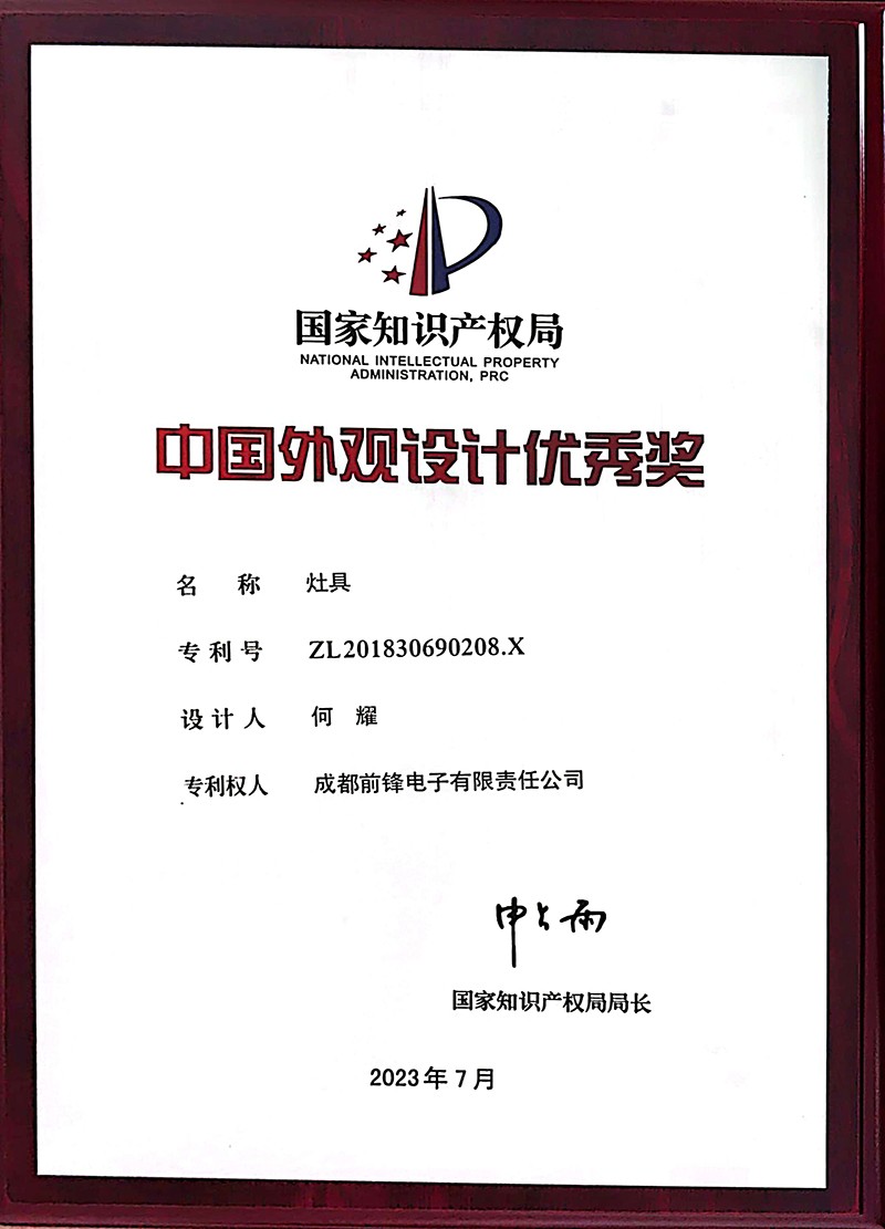 值得一提的是,自2021—2023年,前锋厨电热水器、烟机、燃气灶等产品,凭借其创新的设计和突出的功能,连续3年获得“中国专利优秀奖”、“中国专利外观设计优秀奖”等荣誉,从市场认可到权威认可,诠释了企业品牌实力和创新设计能力!